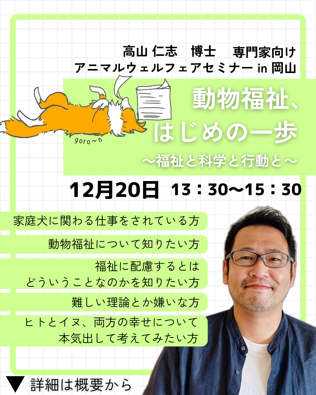 このセミナーでは、心理学のひとつである応用行動分析の枠組みから、イヌとヒトの福祉・QOLの向上についてお話します。